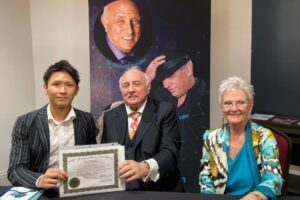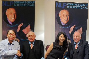 - 今年7月、当校7、8人目となるNLPトレーナー、尾本さん、関口さんが認定されました。(写真はオーランドでのトレーナーコース開催時の創始者リチャード・バンドラーと)